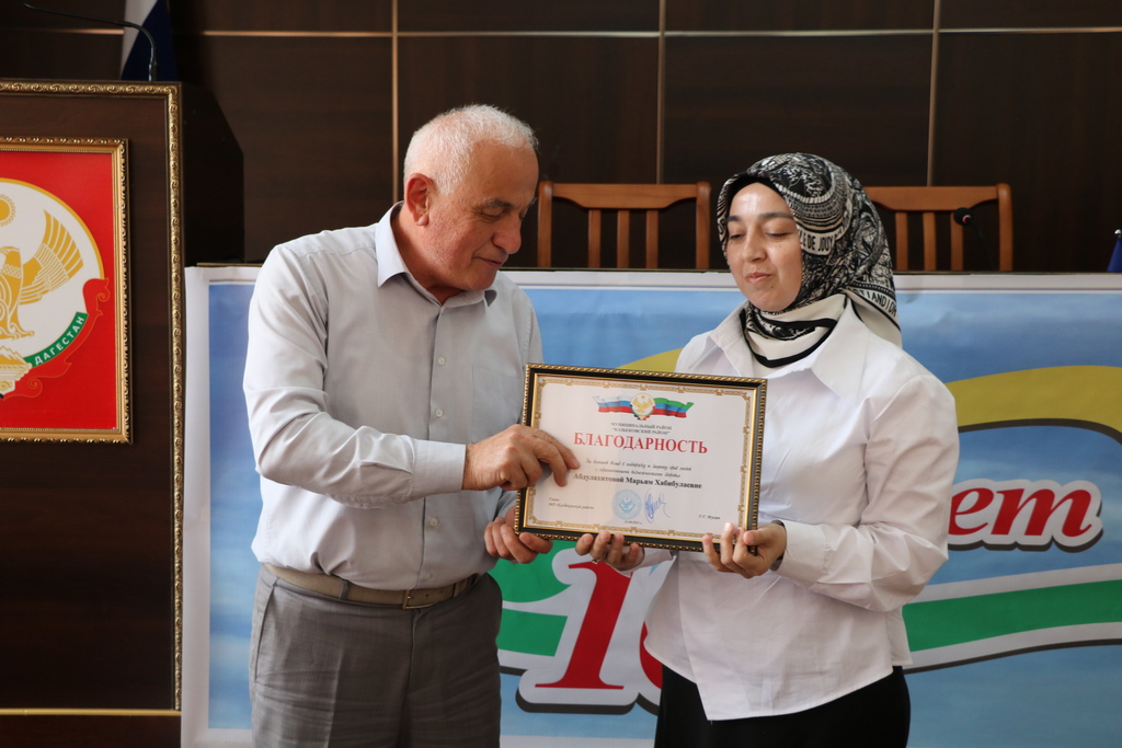 Первый заместитель главы администрации МР Ильяс Шабазов поблагодарил председателя местного отделения Махмуда Абулаева за многолетнюю работу по защите прав инвалидов: