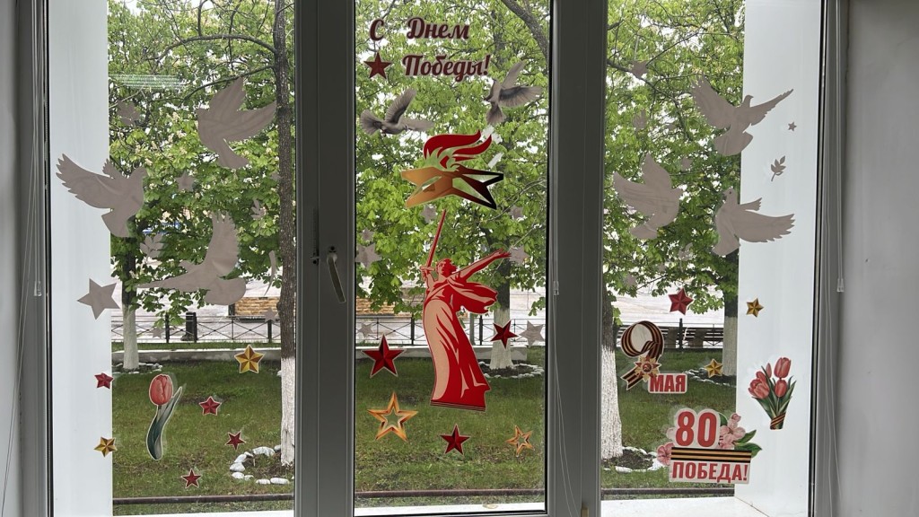 В преддверии 9 мая участники акции украсили окна образовательных учреждений района тематическими композициями. С помощью вырезанных из бумаги изображений на стеклах появились символы Победы: георгиевские ленты, вечный огонь, голуби мира, журавли и праздничные цветы.