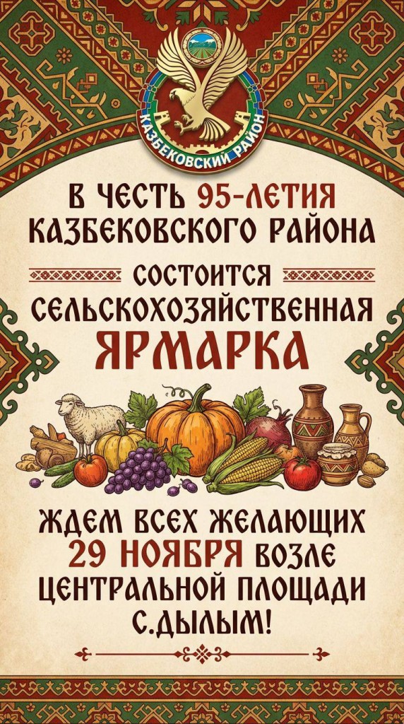 Уважаемые жители и гости Казбековского района! В целях обеспечения продовольственной безопасности населения и в честь празднования Дня работников сельского хозяйства и продовольствия, 11 октября 2025 года на центральной площади села Дылым состоится сельскохозяйственная ярмарка. Читать далее