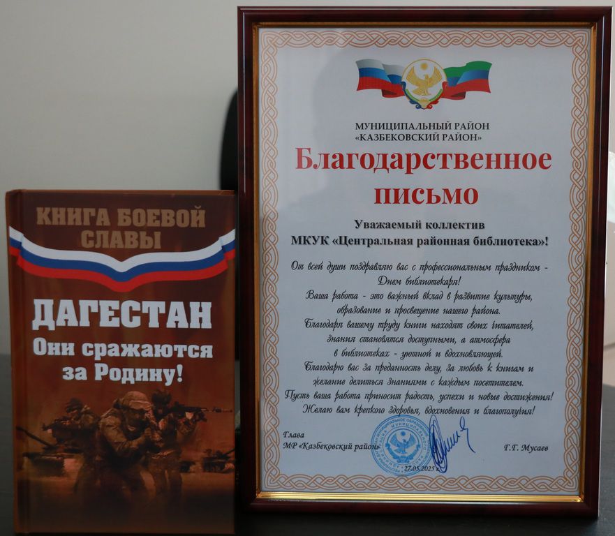 Глава Казбековского района Гаджимурад Мусаев поздравил коллектив Центральной районной библиотеки с профессиональным праздником — Общероссийским днем библиотекаря и вручил Благодарственное письмо за многолетний добросовестный труд.