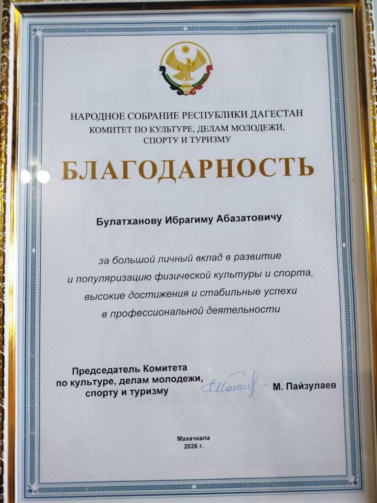 Начальник отдела по физической культуре, спорту, туризму и делам молодёжи администрации МР «Казбековский район» Ибрагим Булатханов отмечен Благодарностью комитета по культуре, делам молодёжи, спорту и туризму Народного Собрания Республики Дагестан за значительный личный вклад в развитие и популяризацию физической культуры и спорта, а также за стабильные успехи в профессиональной деятельности. Награждение состоялось в Махачкале в рамках итоговой конференции Дагестанской региональной общественной организации «Федерация волейбола» за 2025 год.