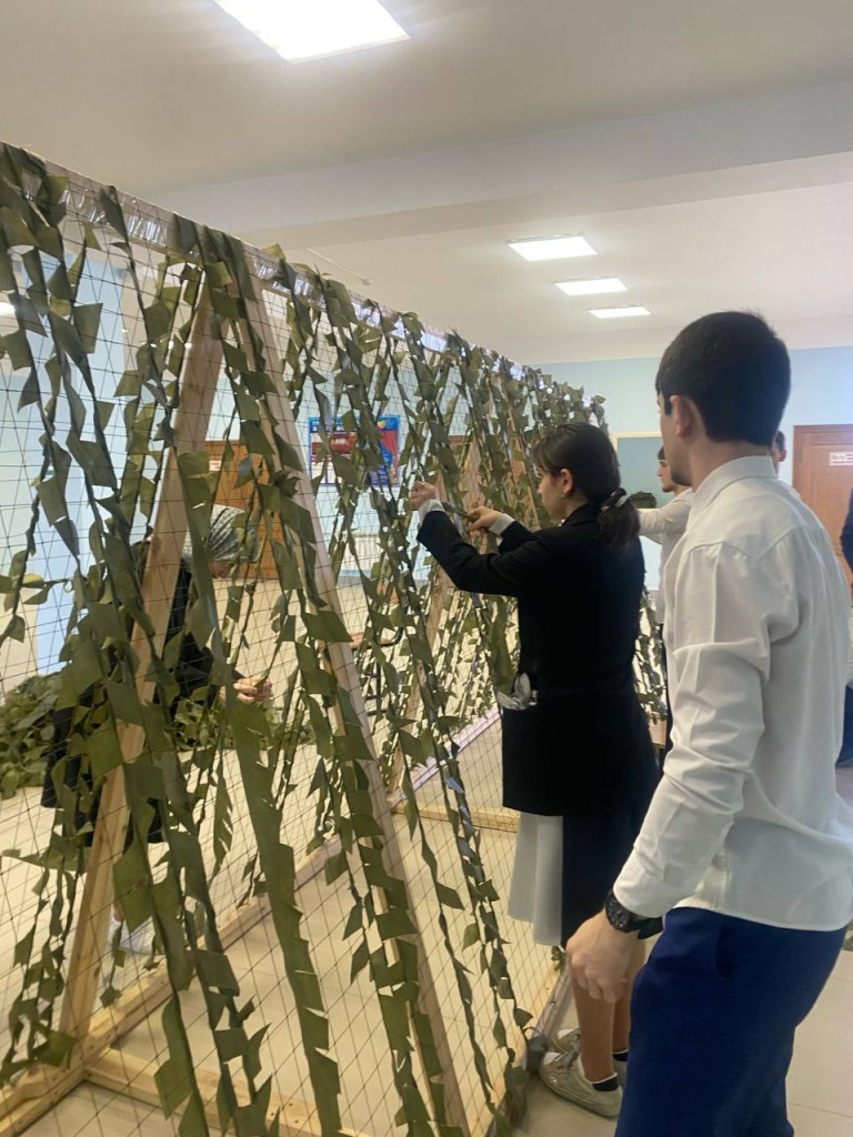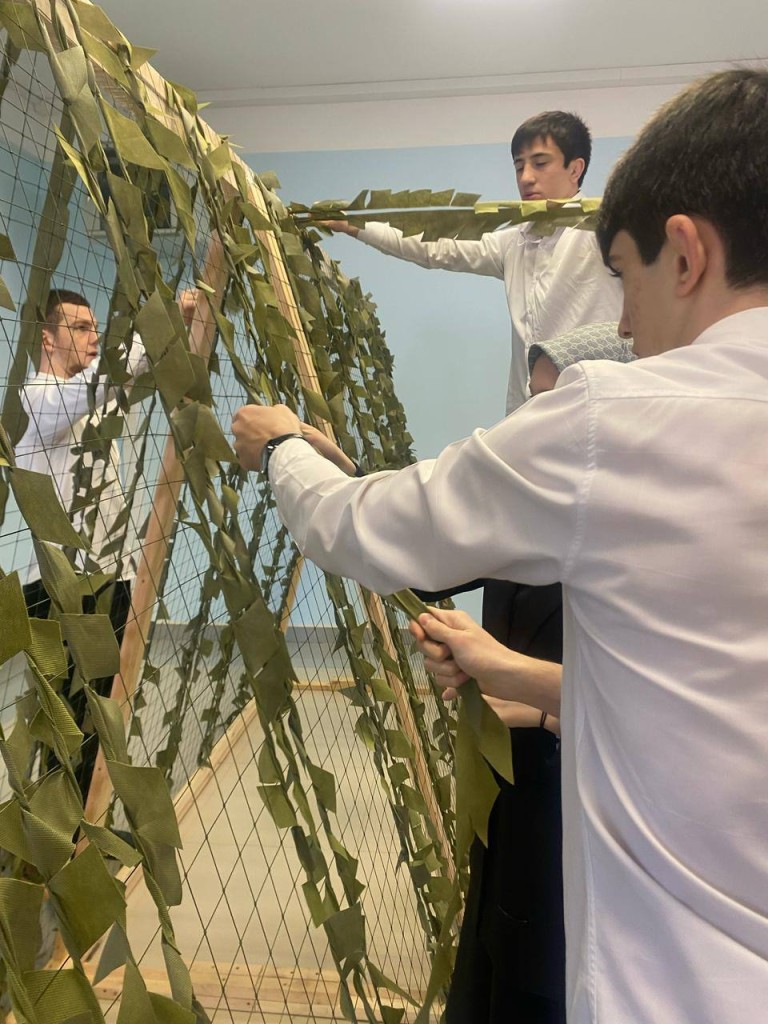 В Ленинаульской средней общеобразовательной школе №3 с декабря 2024 года в помощь нашим военнослужащим в зоне СВО директором школы Рустамом Гаирбековым организовано плетение маскировочных сетей.