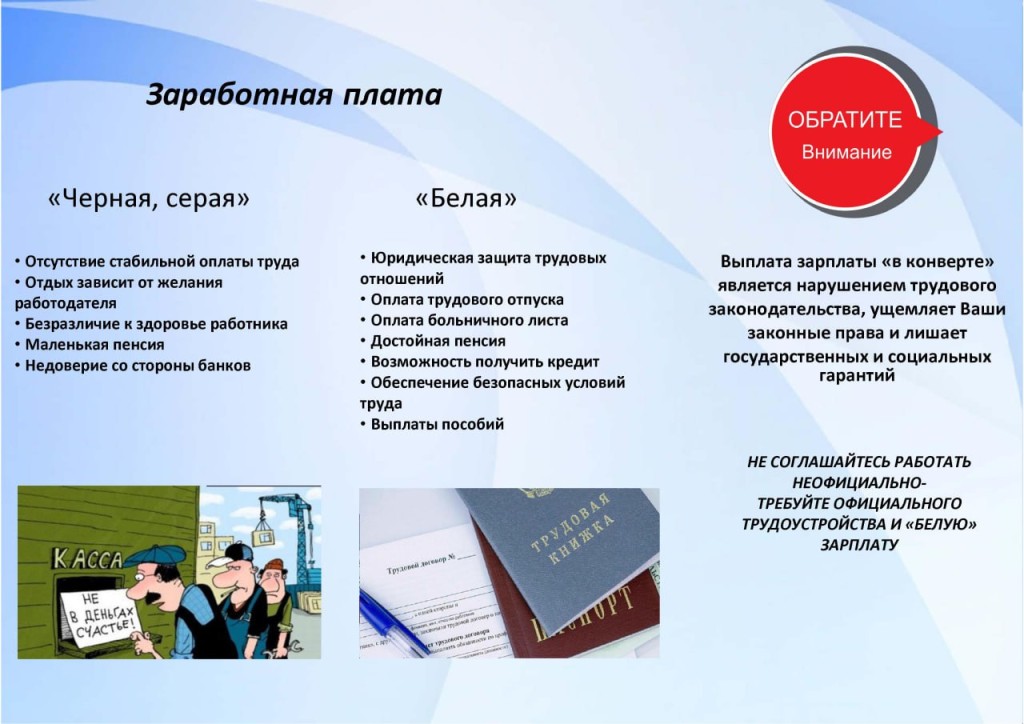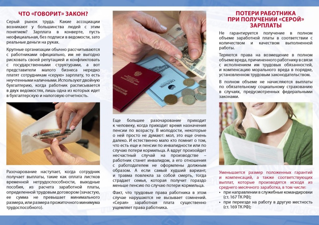 Работникам стоит помнить, что при официально неоформленных трудовых отношениях, в том числе применении «серых схем» выплаты заработной платы, работник не защищен от травматизма и профессиональных заболеваний, при наступлении страхового случая работник лишается выплаты пособия по временной нетрудоспособности, страховой выплаты и возмещения дополнительных расходов пострадавшего на его медицинскую и социальную реабилитацию. Соответственно работник лишает себя возможности получать оплачиваемые больничные листы, оформление отпуска по беременности и родам и отпуск по уходу за ребенком до достижения им 3 лет, пособие по безработице и выходное пособие при увольнении по сокращению штата. Также работник не сможет получить социальный или имущественный налоговый вычет по НДФЛ за покупку жилья, за обучение и лечение, так как работодатель не перечисляет соответствующие суммы в бюджет. Кроме того, неуплата работодателем страховых взносов в будущем приведет к назначению более низких размеров пенсии, такому работнику не идет страховой стаж, в том числе льготный, который установлен для ряда категорий работников в целях досрочного получения трудовой пенсии по старости.