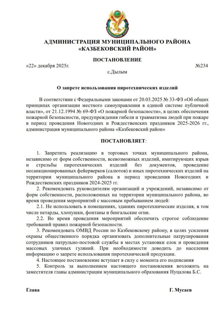 О запрете использования пиротехнических изделий Автор: Т М | 23.12.2025 - 13:42 |23.12.2025 Информация для населения Пост.№234-22.12.2025 Закладка Постоянная ссылка.