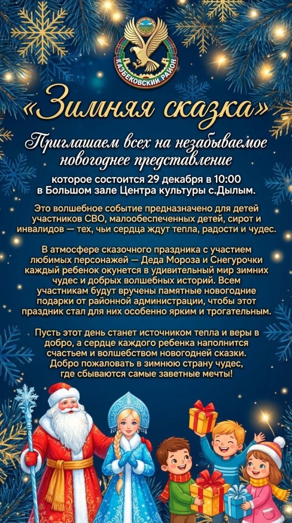 Приглашаем всех на незабываемое новогоднее представление «Зимняя сказка», которое состоится 29 декабря в 10:00 в Большом зале Центра культуры с.Дылым . Это волшебное событие предназначено для детей участников СВО, малообеспеченных детей, сирот и инвалидов — тех, чьи сердца ждут тепла, радости и чудес.