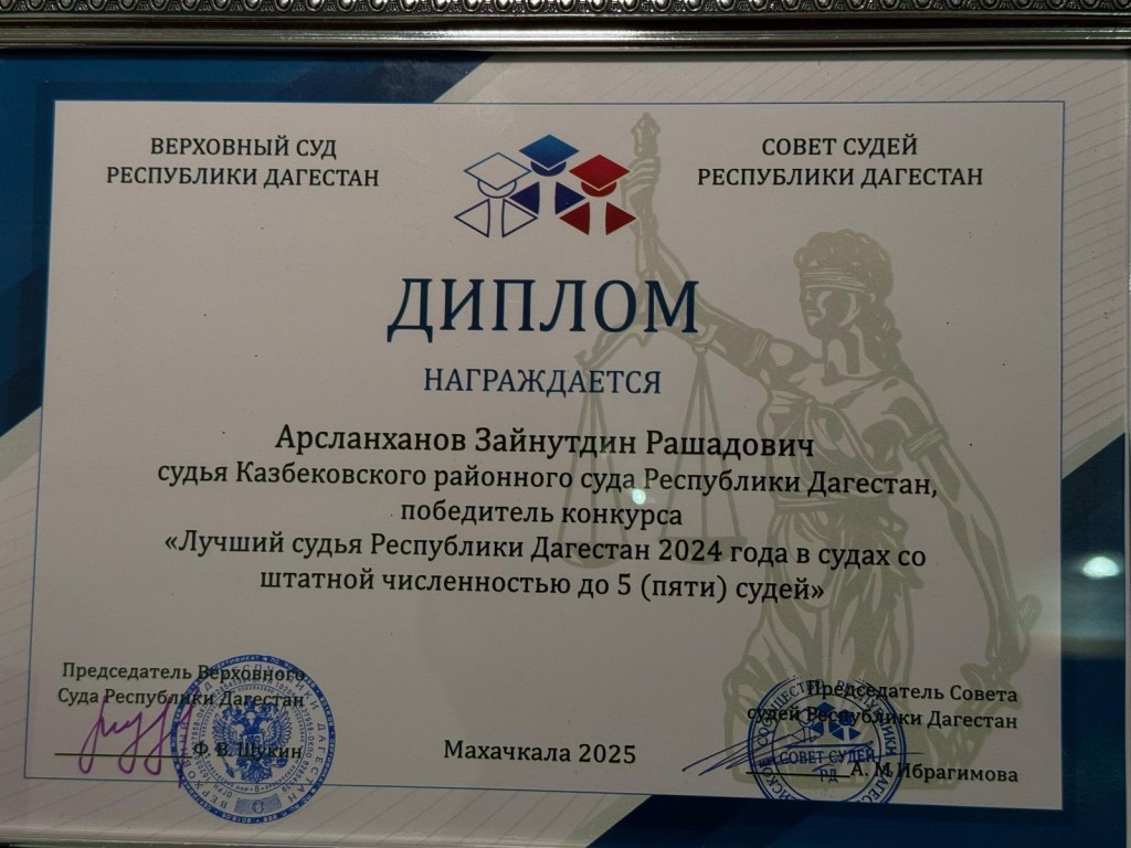 Судья Казбековского районного суда Зайнудин Арсланханов признан победителем в одной из номинаций конкурса «Лучший судья Республики Дагестан»