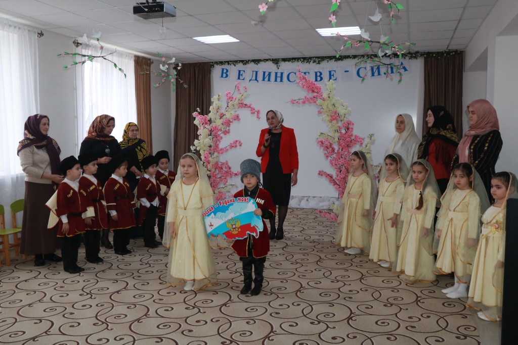 В Центре развития ребенка №1 «Сказка» с.Дылым состоялось торжественное открытие Года единства народов России — 2026. Мероприятие объединило воспитанников, педагогов и приглашенных гостей, в числе которых: руководитель аппарата администрации МР Гамзатова Марьям-Асият, методист информационно-методического центра Управления образования Латипова Марият, руководитель Единого информационного центра Качалаева Наталья, председатель Совета ветеранов Магомедхабибов Хункарби, исполнительный секретарь местного отделения партии «Единая Россия» Ибрагимов Мурад, заместитель начальника ЦТКНР Ганищев Рамазан, ответственный секретарь районной газеты «Чапар» Айтемирова Пата.