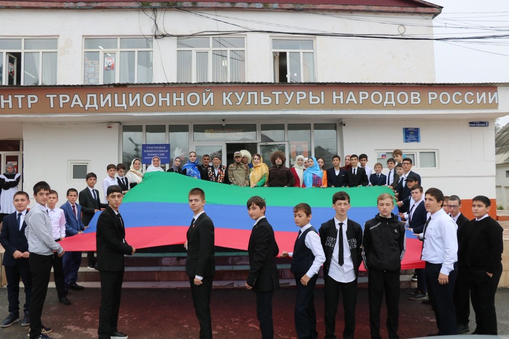 Кульминацией праздника стало развертывание большого дагестанского флага на крыльце Центра культуры, символизирующим единство и сплоченность жителей района.