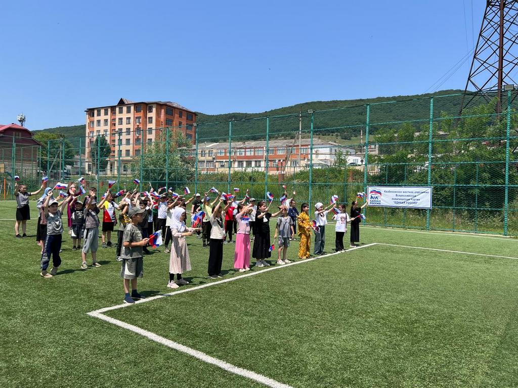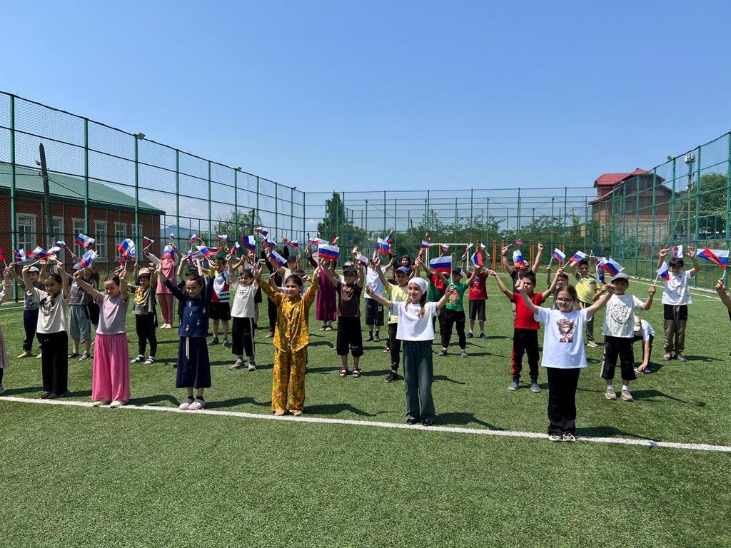 В детском пришкольном лагере на базе Дылымской гимназии прошло праздничное мероприятие, начавшееся с поднятия флага и исполнения гимна, продолжилось ярким флешмобом детишек под песню «Моя Россия».