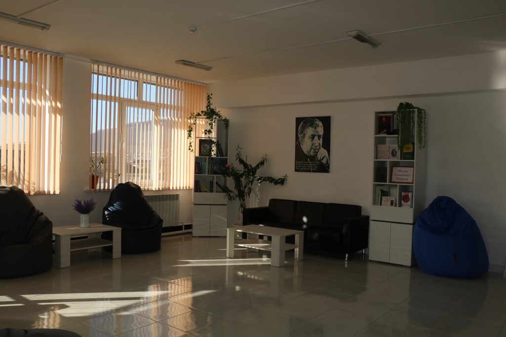 Выставочный стенд, экспозиция которого регулярно обновляется к памятным и знаменательным датам. Просторная зона отдыха для неформального общения. Методический кабинет, созданный для комфортной работы сотрудников библиотеки.